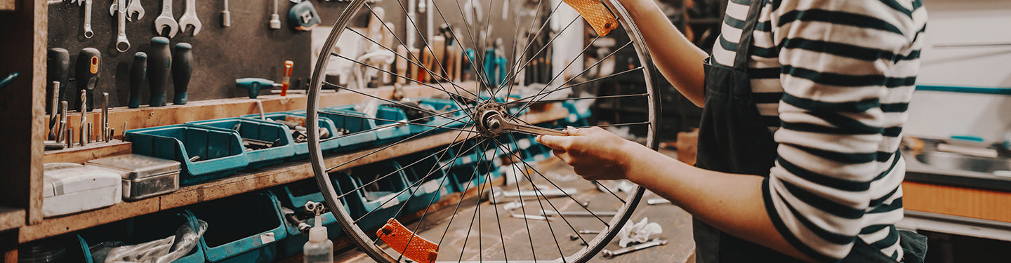 Personne dans un atelier vélo qui répare une roue avec des pièces détachées